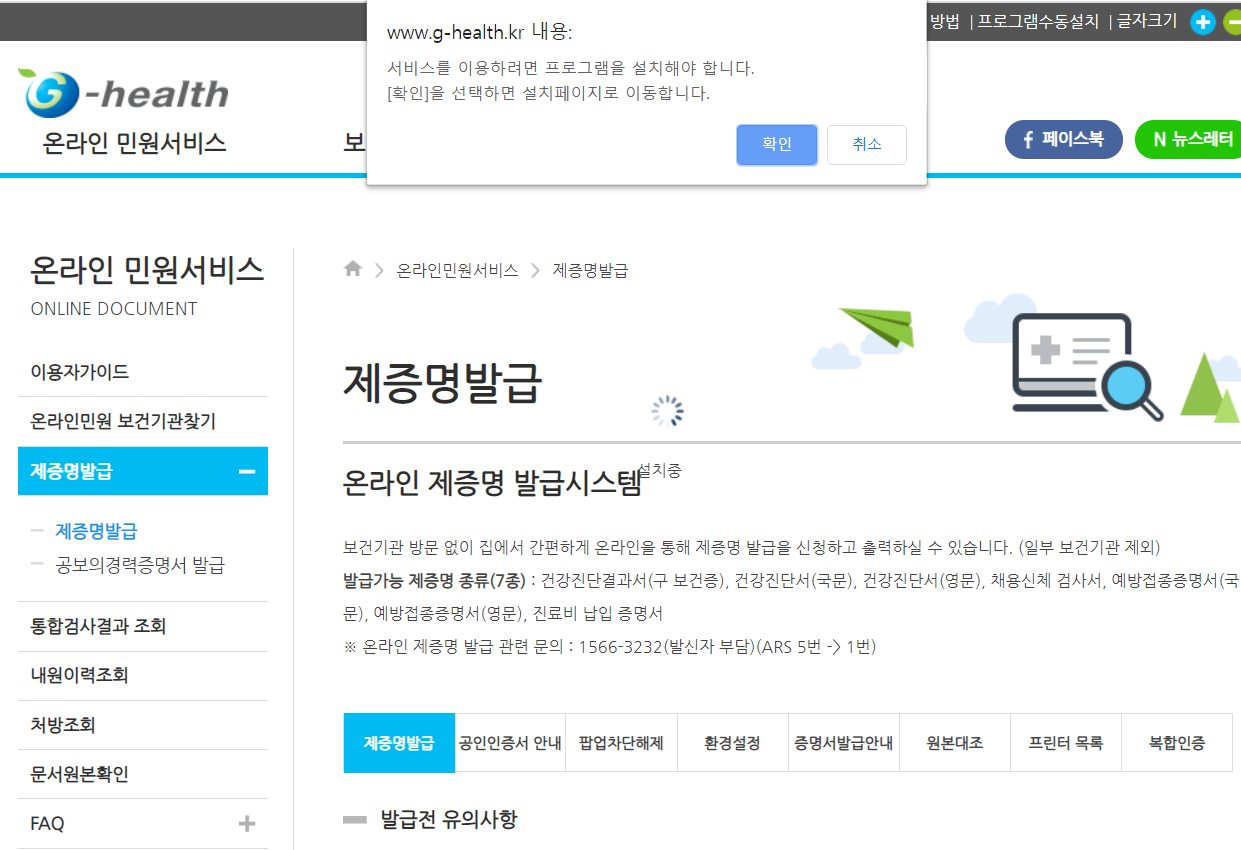 3. "제증명발급" 클릭 시 필요 프로그램 설치 안내나옵니다.