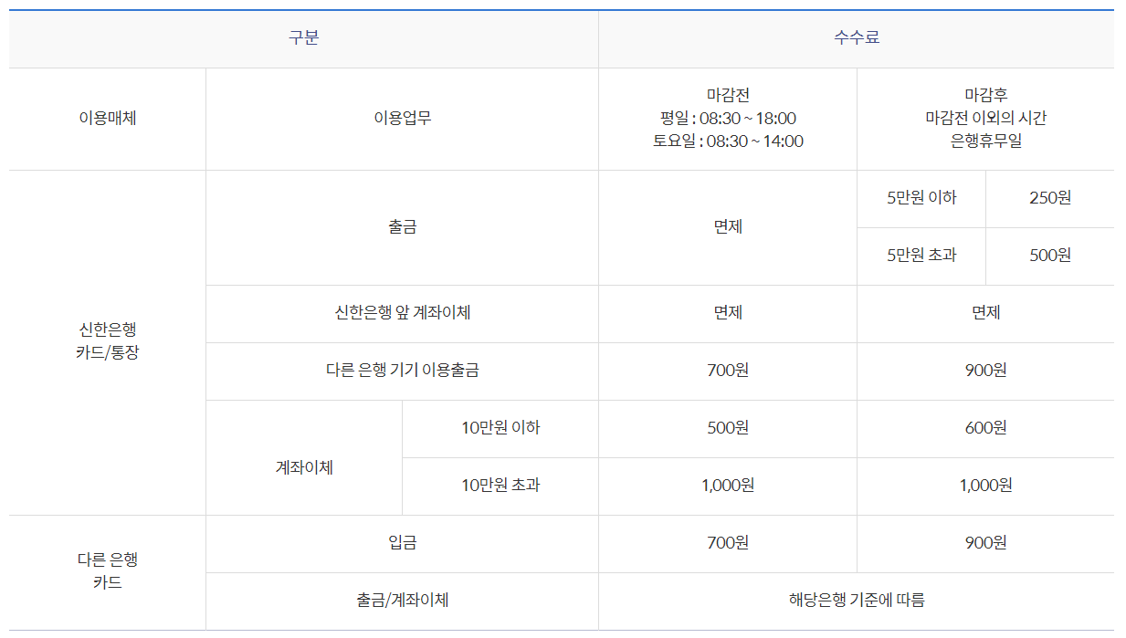 신한은행 카드 및 통장으로 그 외 시간대 출금 진행 시 5만원 이하는 250원 / 5만원 초과는 500원의 수수료가 부과됩니다.