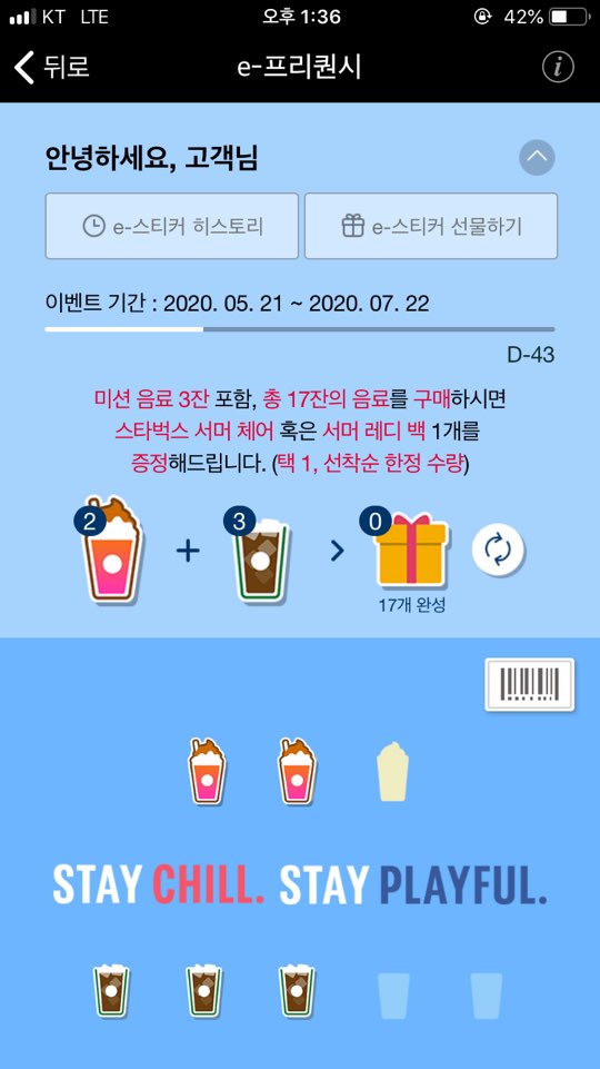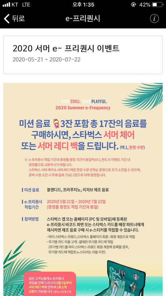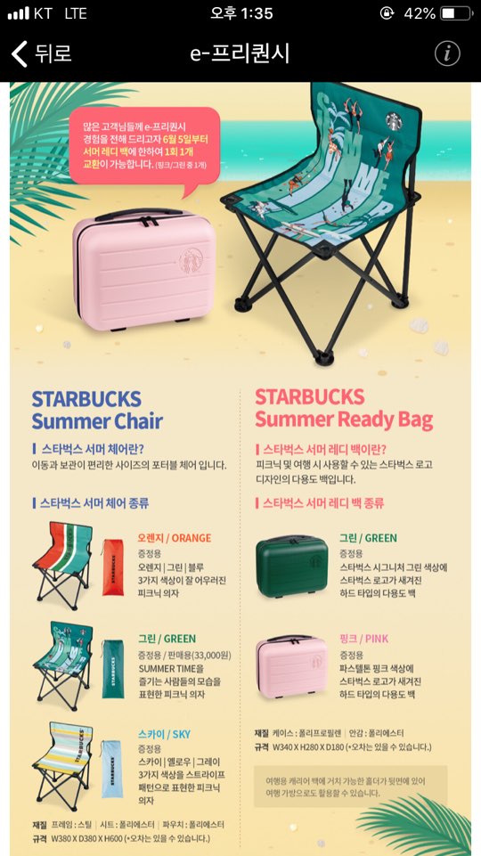 스타벅스 이프리퀀시 이벤트를 통하여 스타벅스 서머체어, 서머레디백을 얻을 수 있습니다.