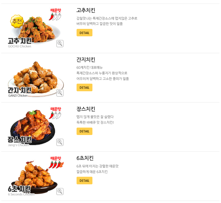 | 치킨메뉴 간지치킨 → 18,900원 고추치킨 → 18,900원 후라이드 → 16,900원 양념치킨 → 17,900원 장스치킨 → 18,900원 6초치킨 → 18,900원 더간지치킨 → 19,900원 더매운고추치킨 → 19,900원 간지순살치킨 → 18,900원 고추치킨순살 → 18,900원 후라이드순살 → 16,900원 양념치킨순살 → 17,900원 장스치킨순살 → 18,900원 6초치킨순살 → 18,900원 더매운고추치킨순살 → 19,900원 |