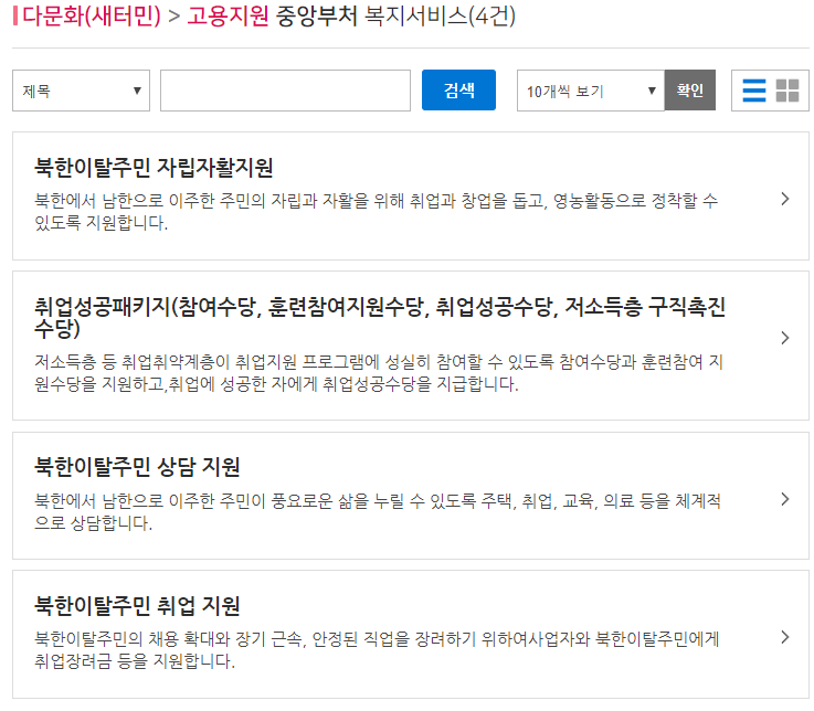 | 취업지원, 취업성공패키지(참여수당, 훈련참여지원수당, 취업성공수당, 저소득층 구직촉진수당 북한이탈주민 상담지원, 자립자활지원 |