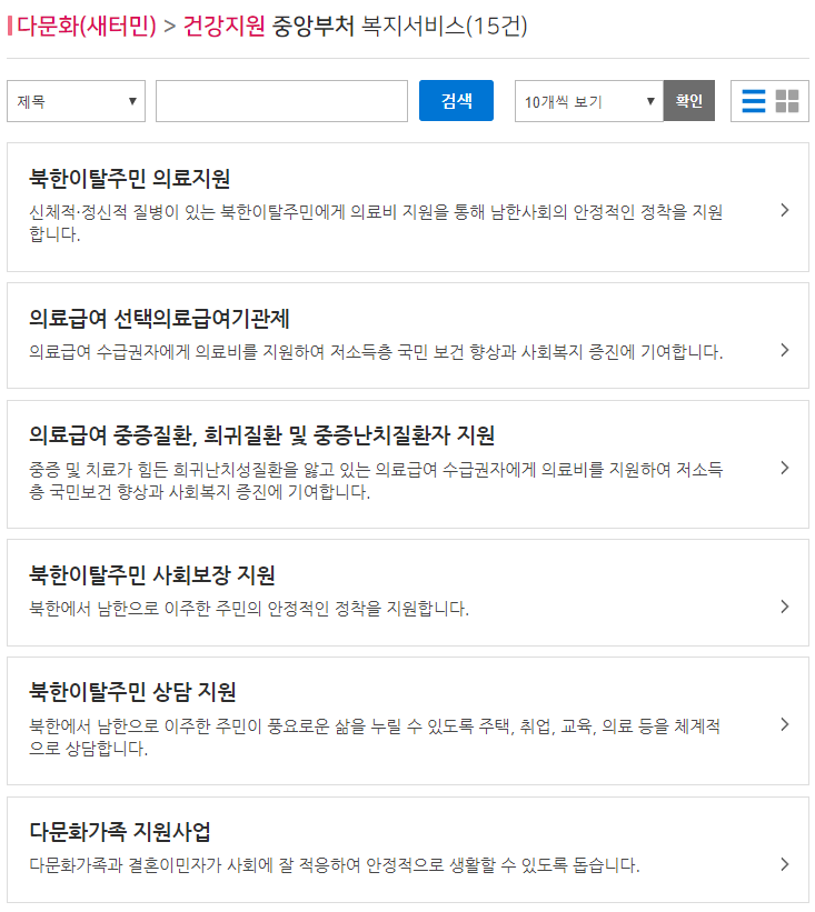 | 정신건강복지센터운영(아동청소년정신건강증진사업 포함), 상담지원, 의료급여 중증질환, 희귀질환 및 중증난치질환자 지원, 의료급여장애인보장구 지원, 의료급여, 요양비, 지역사회서비스 투자사업, 북한이탈주민 의료지원, 의료급여본인부담면제, 외국인근로자 등 의료지원, 다문화가족 지원사업, 의료급여 선택의료급여기관제, 의료급여(의료급여대지급금지원) |