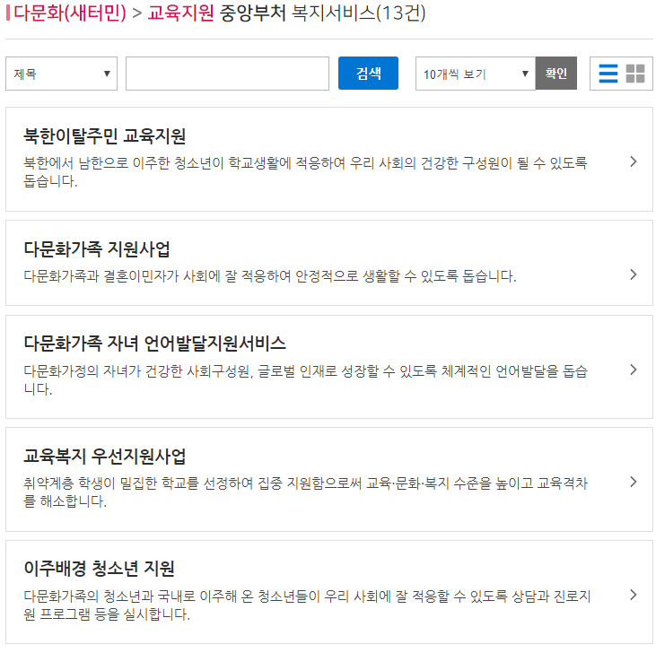 | 이주배경 청소년 지원, 북한이탈주민 교육비 지원, 다학생 멘토링, 다문화가족 지원사업, 청소년 방과후 아카데미 운영 지원, 다문화 보육료 지원, 다문화가족 방문교육 서비스, 북한이탈주민 교육지원, 북한이탈주민 상담 지원, 교육복지 우선지원사업, 탈북학생 교육지원, 다문화가정, 농어업인 정보화 교육, 다문화가족 자녀 언어발달지원서비스, |