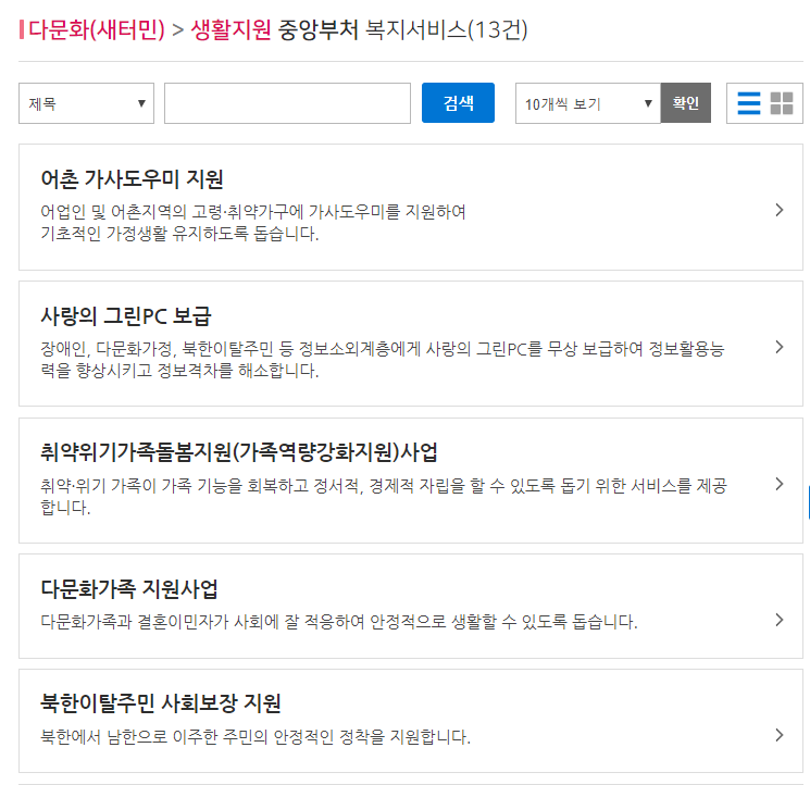| 북한이탈주민 의료지원, 취약농가 인력지원, 주택알선, 어촌 가사도우미 지원, 다문화가족 지원사업, 북한이탈주민 상담지원, 북한이탈주민 자산형성지원제도, 사랑의 그린 pc 보급, 결혼 이민자 통번역 서비스, 북한이탈주민 정착금지원, 사회보장지원, 취약계층 환경성질환 예방사업, 취약위기가족돌봄지원 사업 |