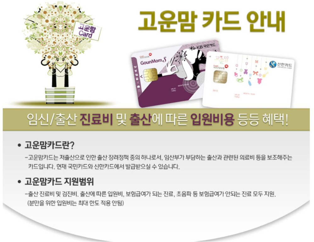 임신/출산 진료비 및 출산에 따른 입원비용 혜택을 받기위해 고운맘카드가 필요합니다.