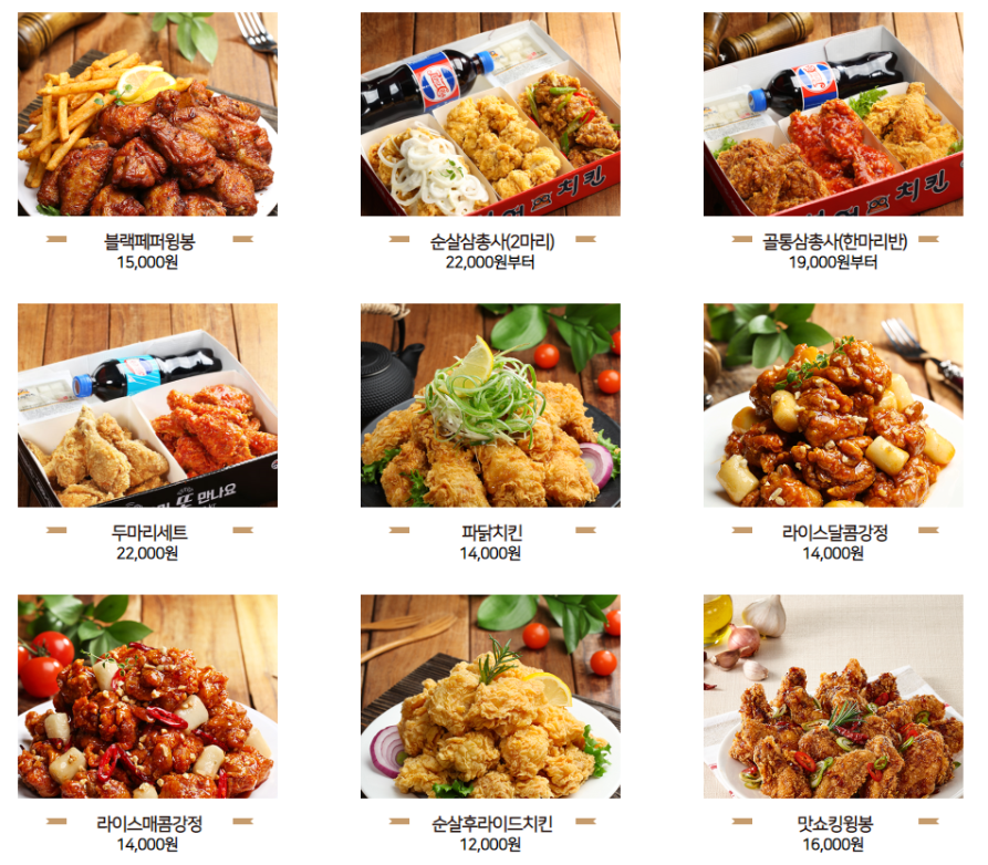 | 블랙페퍼윙봉 15,000 원 순살삼총사(2마리) 22,000 원 골통삼총사(한마리반) 19,000 원 두마리세트 22,000 원 파닭 치킨 14,000 원 라이스달콤강정 14,000 원 라이스매콤강정 14,000 원 순살후라이드 치킨 12,000 원 맛쇼킹윙봉 16,000원 |
