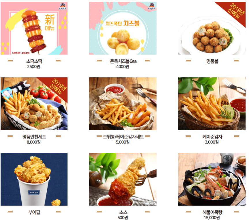 | 소떡소떡 2500 원 쫀득치즈볼6ea 4000 원 명품만찬세트 8,000 원 오튀봉, 케이준감자세트5,000 원 케이준감자 3,000 원 소스 500 원 해물어묵탕 15,000 원 |