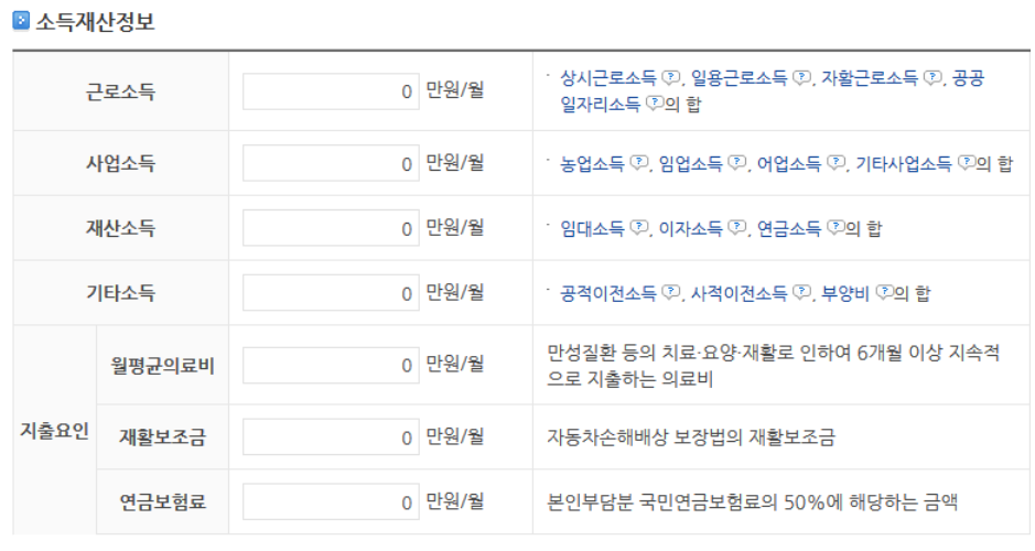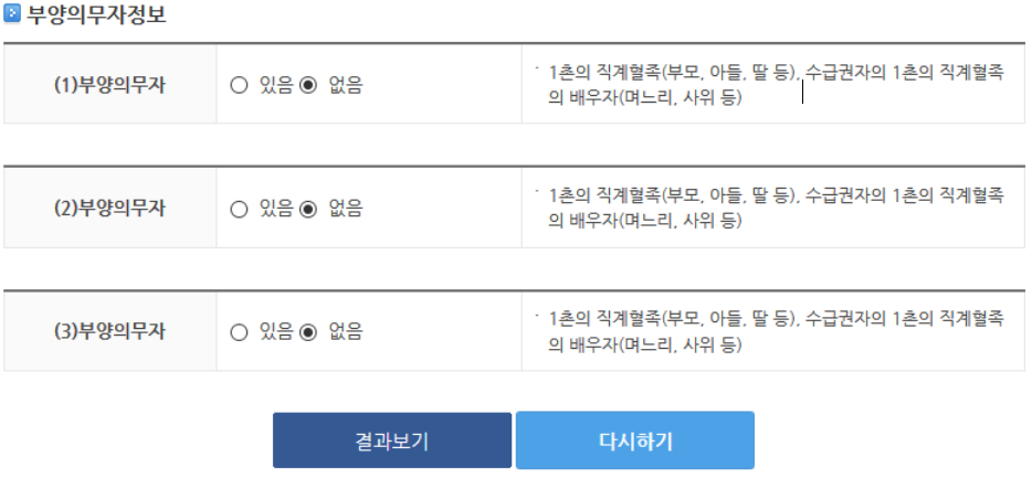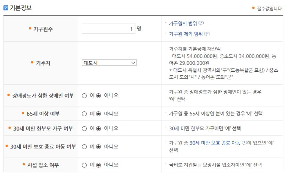 위 항목에 대해서 기재를 하고 결과보기 클릭하면 기초생활수급자 대상자인지 확인이 가능합니다.