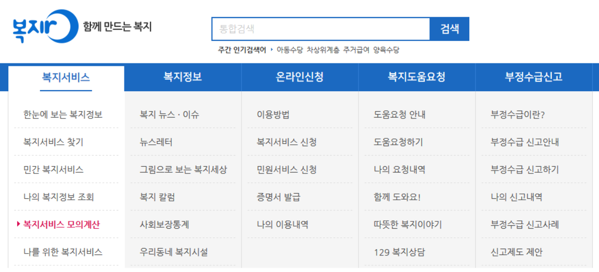 1. 복지서비스 -> 복지서비스 모의계산에 접속해주세요