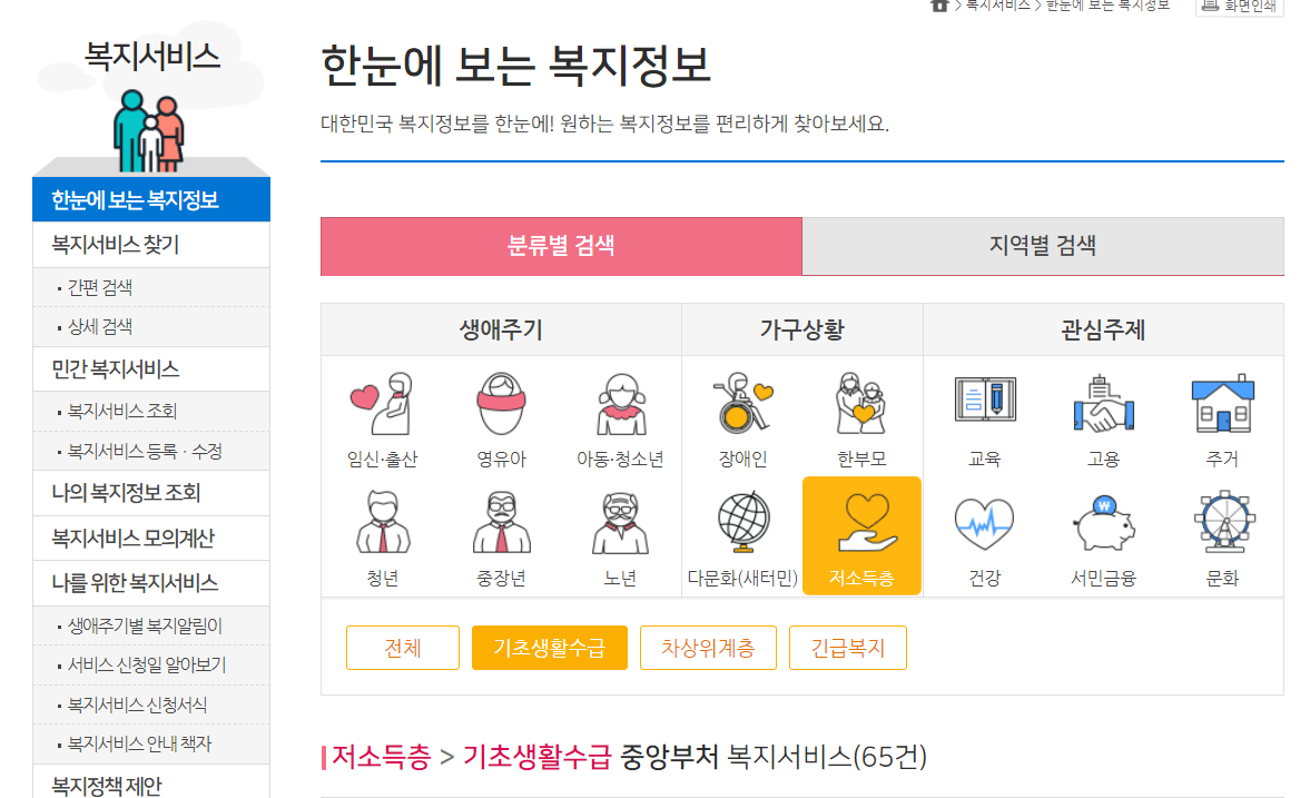 3. 한눈에 보는 복지정보에서 "저소득층" -> "기초생활수급"을 클릭해주세요