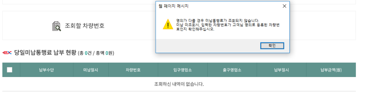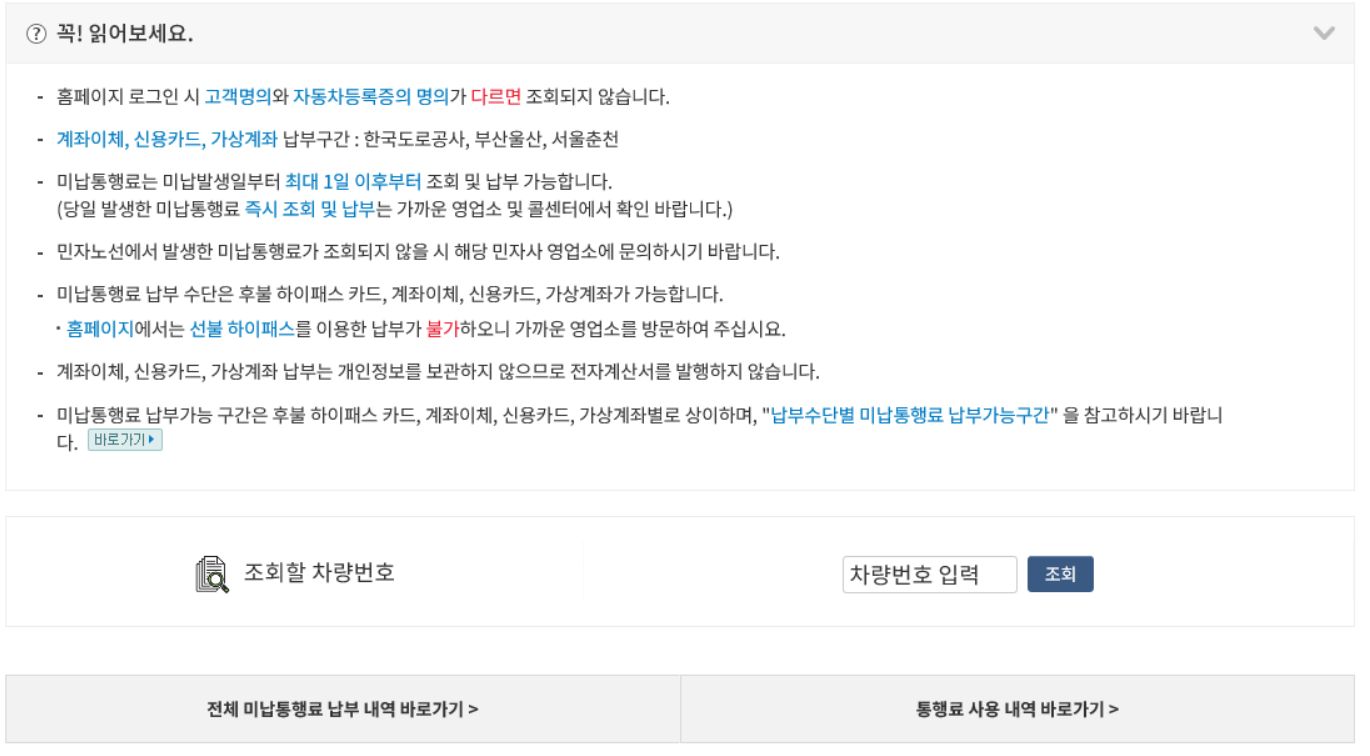 본인의 차량번호를 입력 후 조회를 진행하시면 미납 통행료에서 확인이 가능하오니 참고 부탁드립니다.