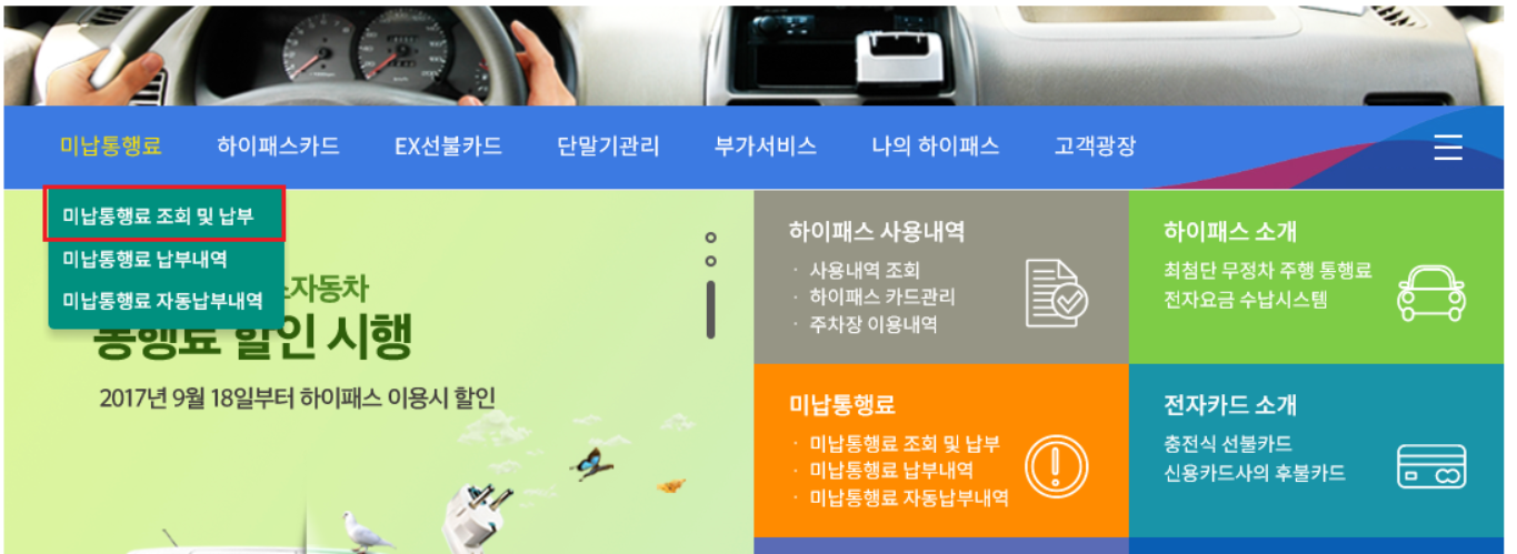 - 미납통행료 조회 및 납부 메뉴에 접속하시면 됩니다.