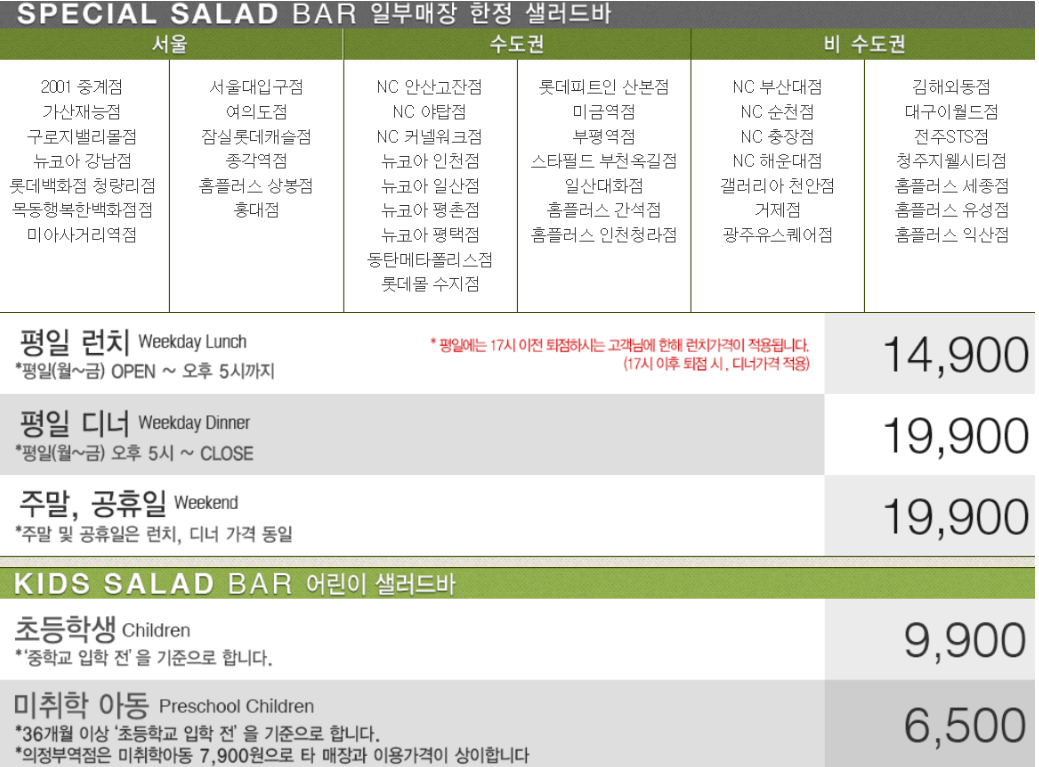 3개 매장 기준으로 각각 샐러드바 가격이 다르며 샐러드바 종류도 다르니 참고하시면 될 듯 합니다.