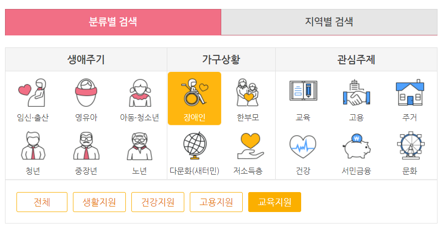 3. 분류별 검색에서 "장애인" 선택 후 하단 4가지 교육지원을 클릭하시면 상세내용이 확인 가능합니다.