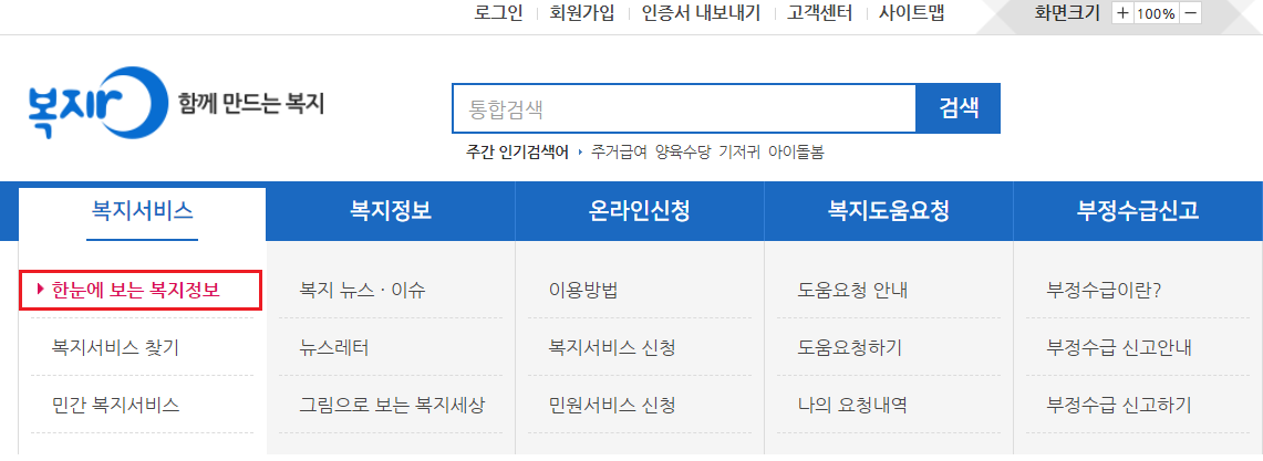 2. 복지로 사이트 상단 "한눈에 보는 복지정보" 클릭해주세요