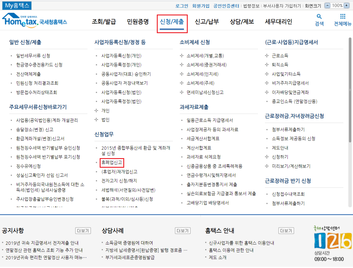 3. 상단 카테고리 "신청/제출" 경로를 통해 신청업무에서 "휴 페업신고"를 클릭해주세요