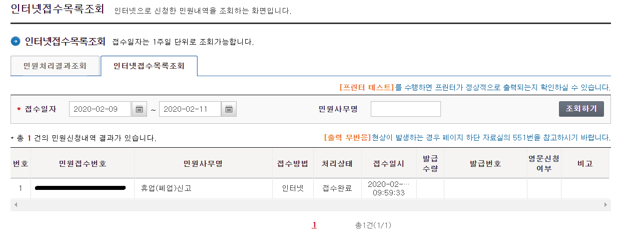 7. 사업자 폐업신고 완료 후 "인터넷접수 목록 조회"에서 확인 가능합니다.