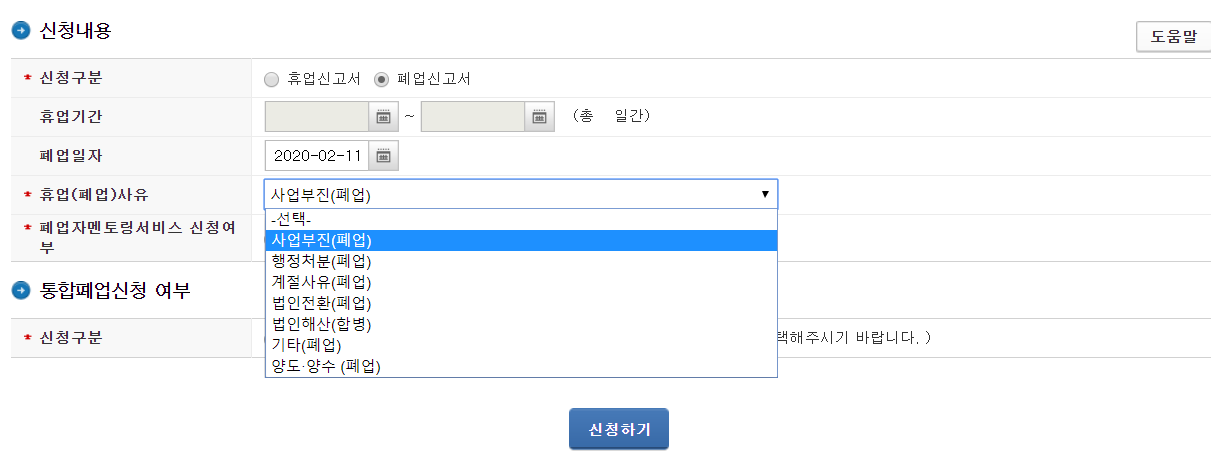 5. 신청내용에서 페업사유를 선택하시면 됩니다.