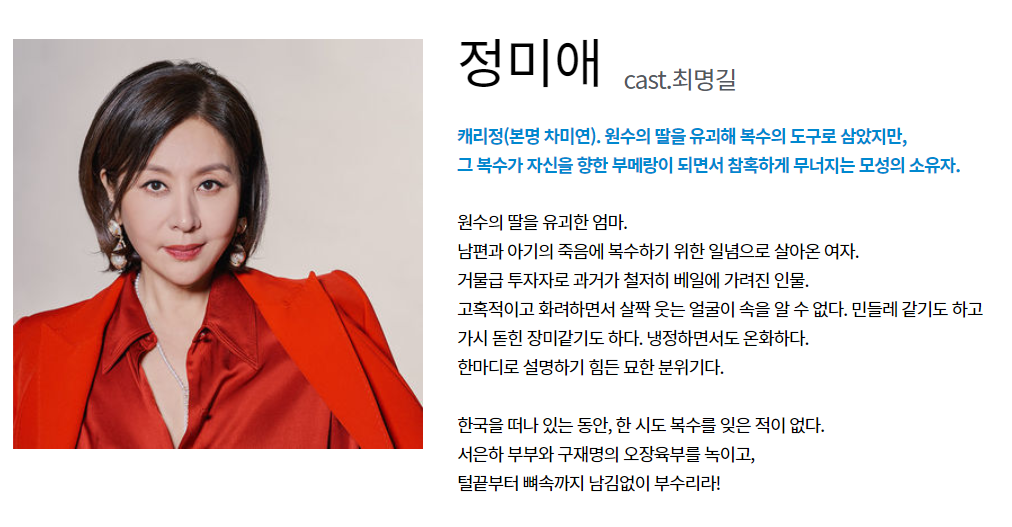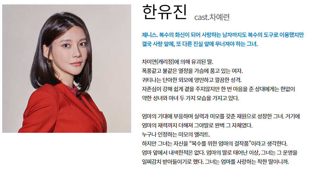 복수의 화신이 되어 사랑하는 남자까지도 복수의 도구로 이용을 하는 인물입니다.