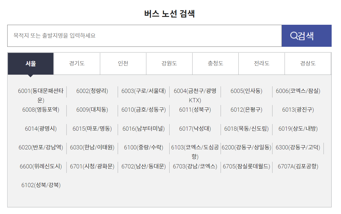 4. 버스노선검색을 통해서 각 지역별 목적지 또는 출발지명을 검색해서 확인 할 수 있습니다.